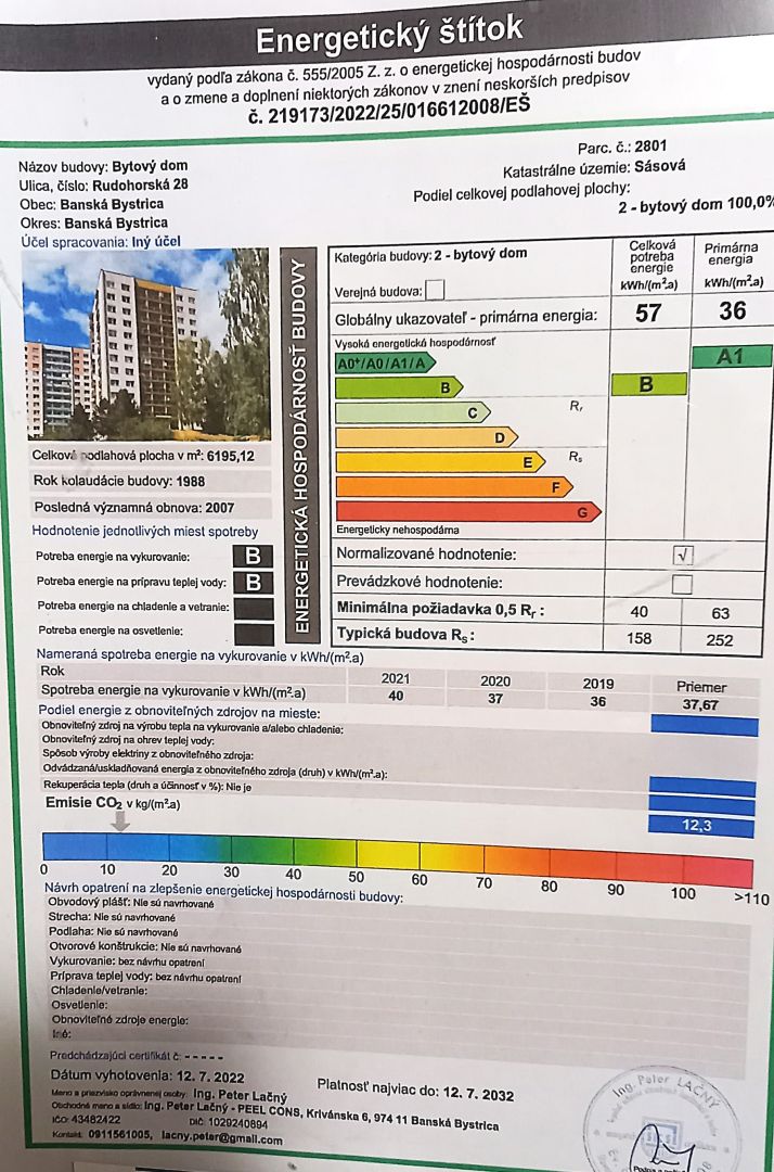 Energetická hospodárnosť budovy bola certifikátom určená na kategóriu A1 a B.